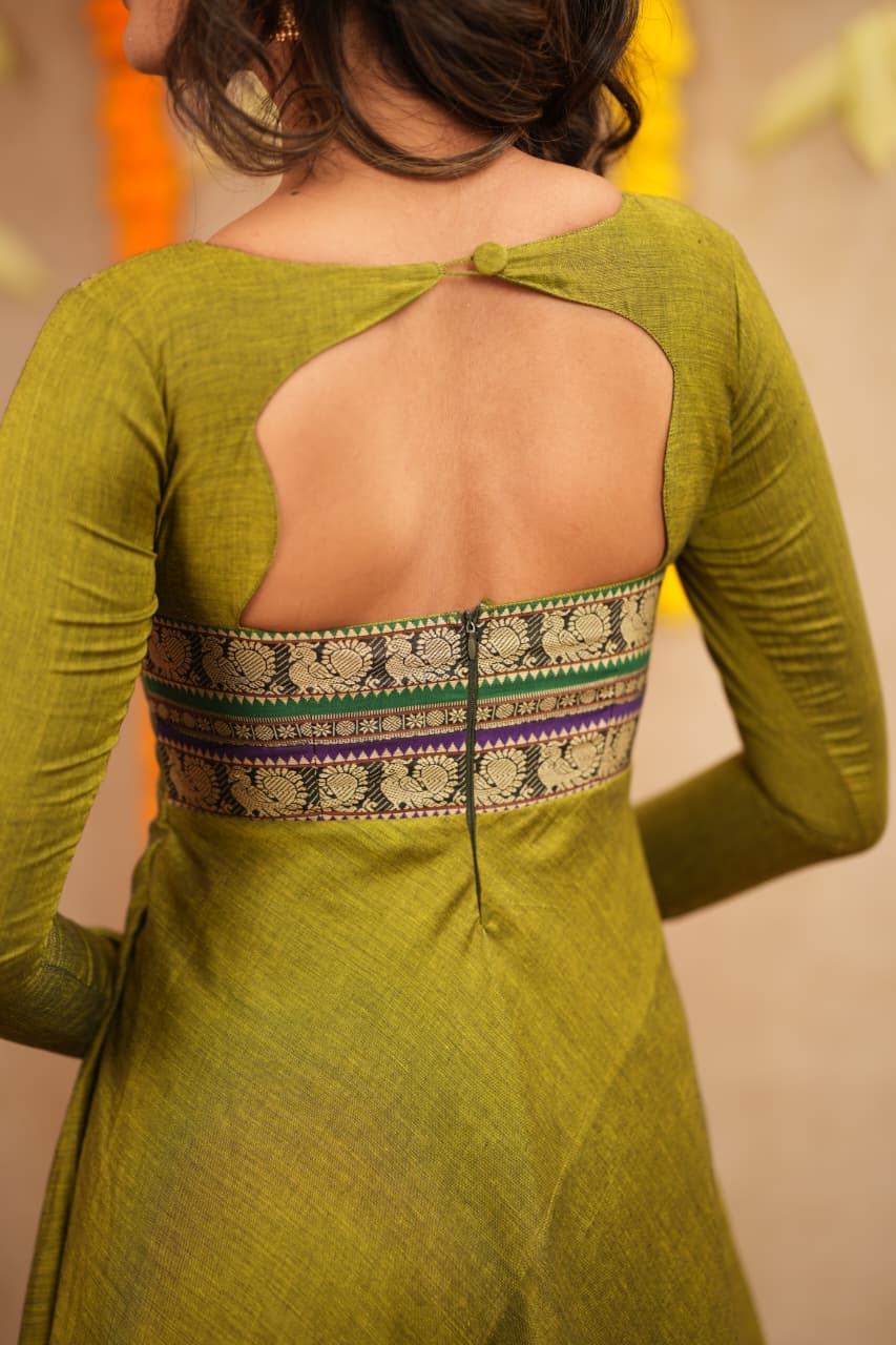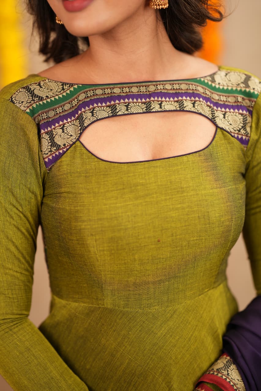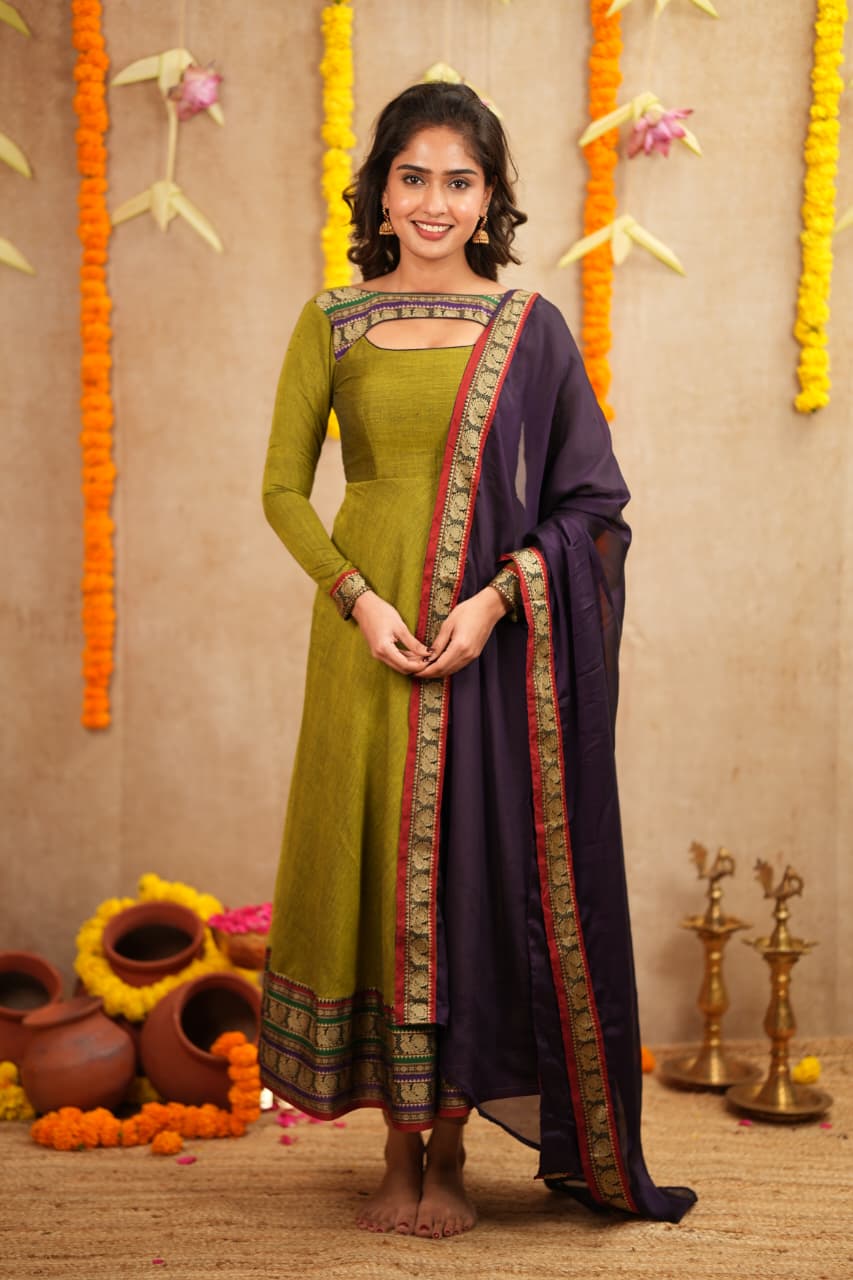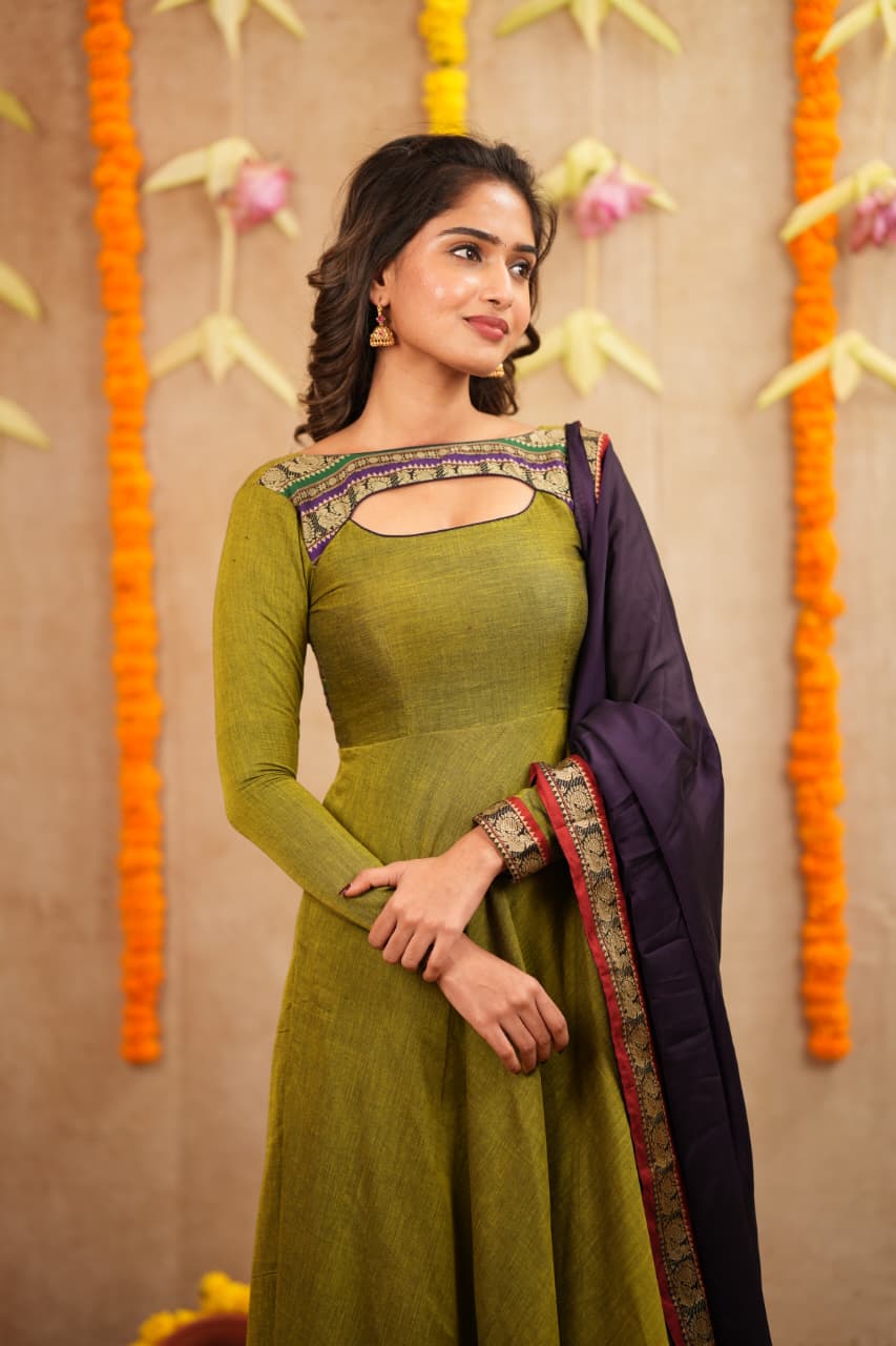 The Kannama Collection showcases a beautifully crafted Anarkali made from rich handloom cotton, designed for effortless elegance and all-day comfort. The naturally breathable fabric, graceful flare, and timeless silhouette make it a perfect choice for those who love understated traditional charm with a refined finish.