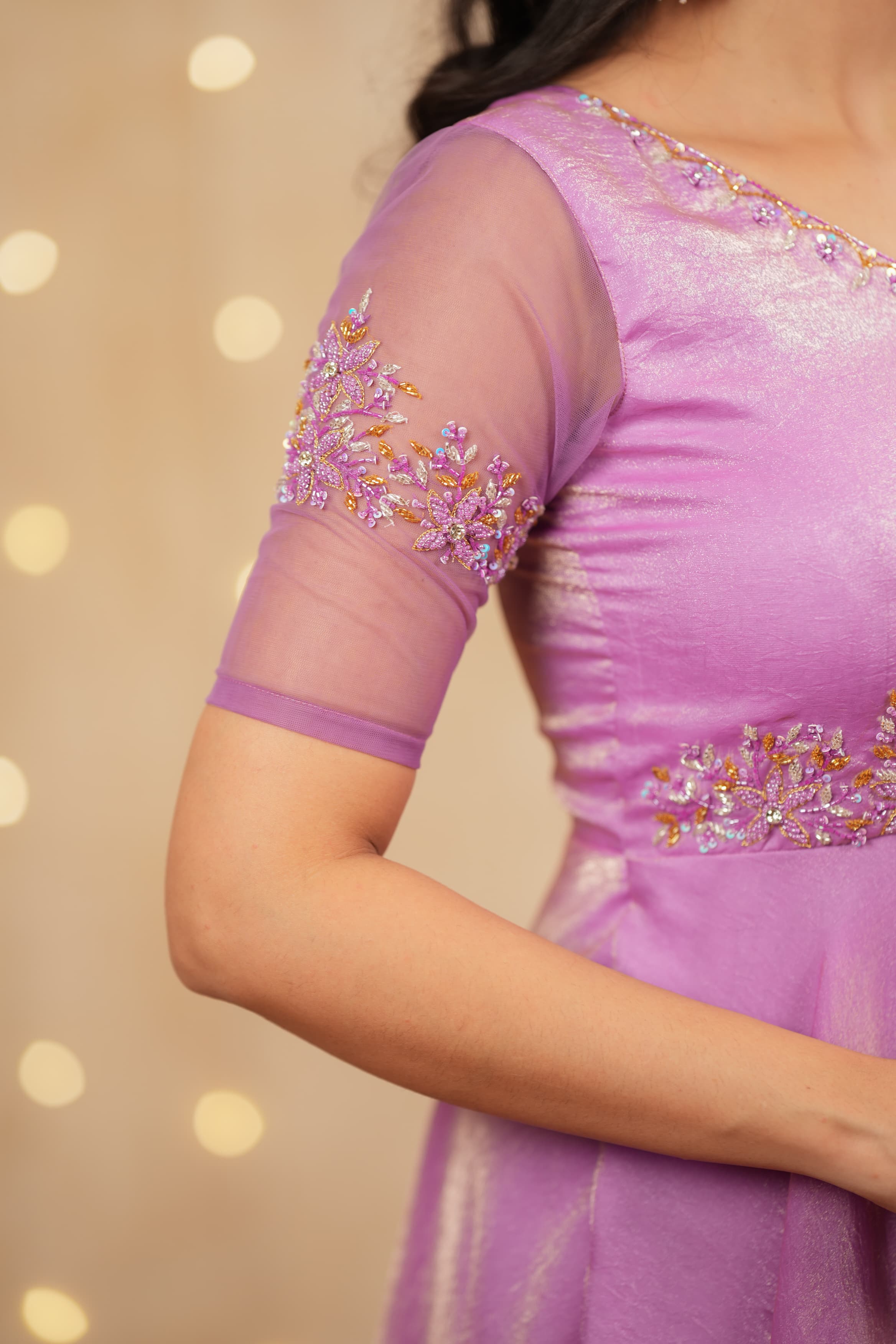 • Sleeves: Net sleeves with handwork