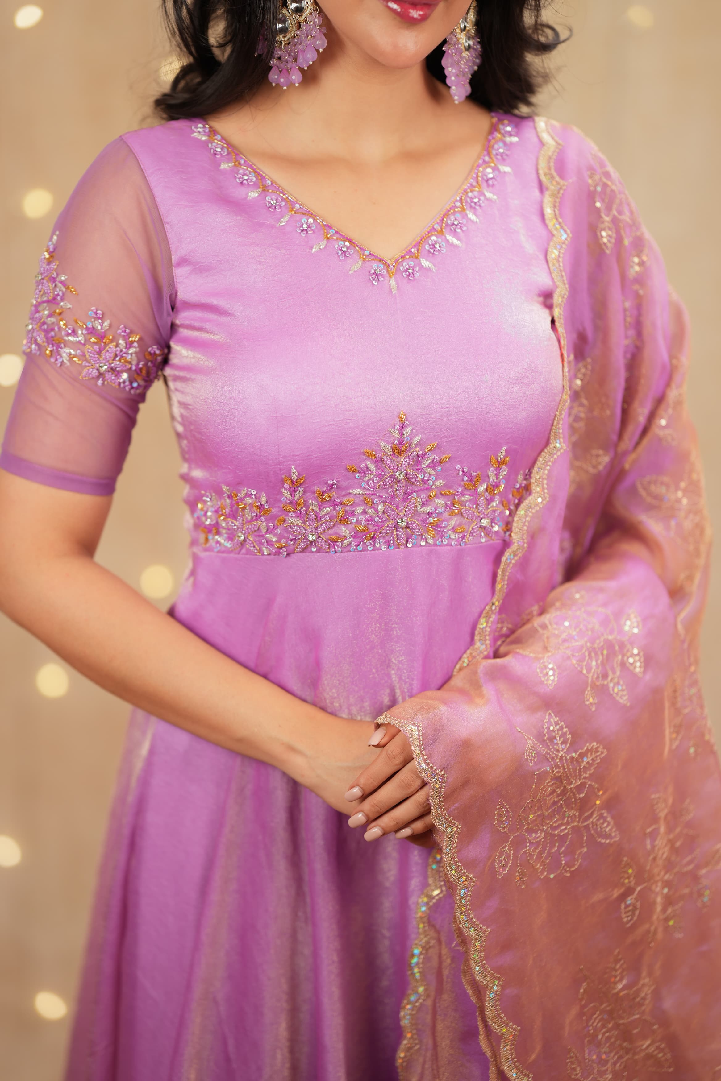 Styled with elegant net sleeves adorned with intricate handwork, adding a touch of sophistication and enhancing the overall designer appeal of the outfit.