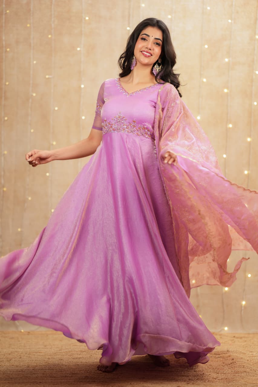 The Reshmi Collection features a graceful Anarkali crafted from premium crush tissue fabric, designed to give a rich flow and elegant fall. The soft shimmer of the fabric paired with delicate handwork detailing adds a luxurious festive charm, making this ensemble effortlessly eye-catching.