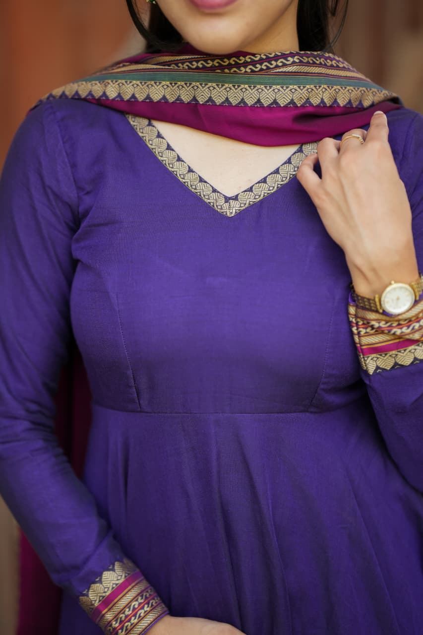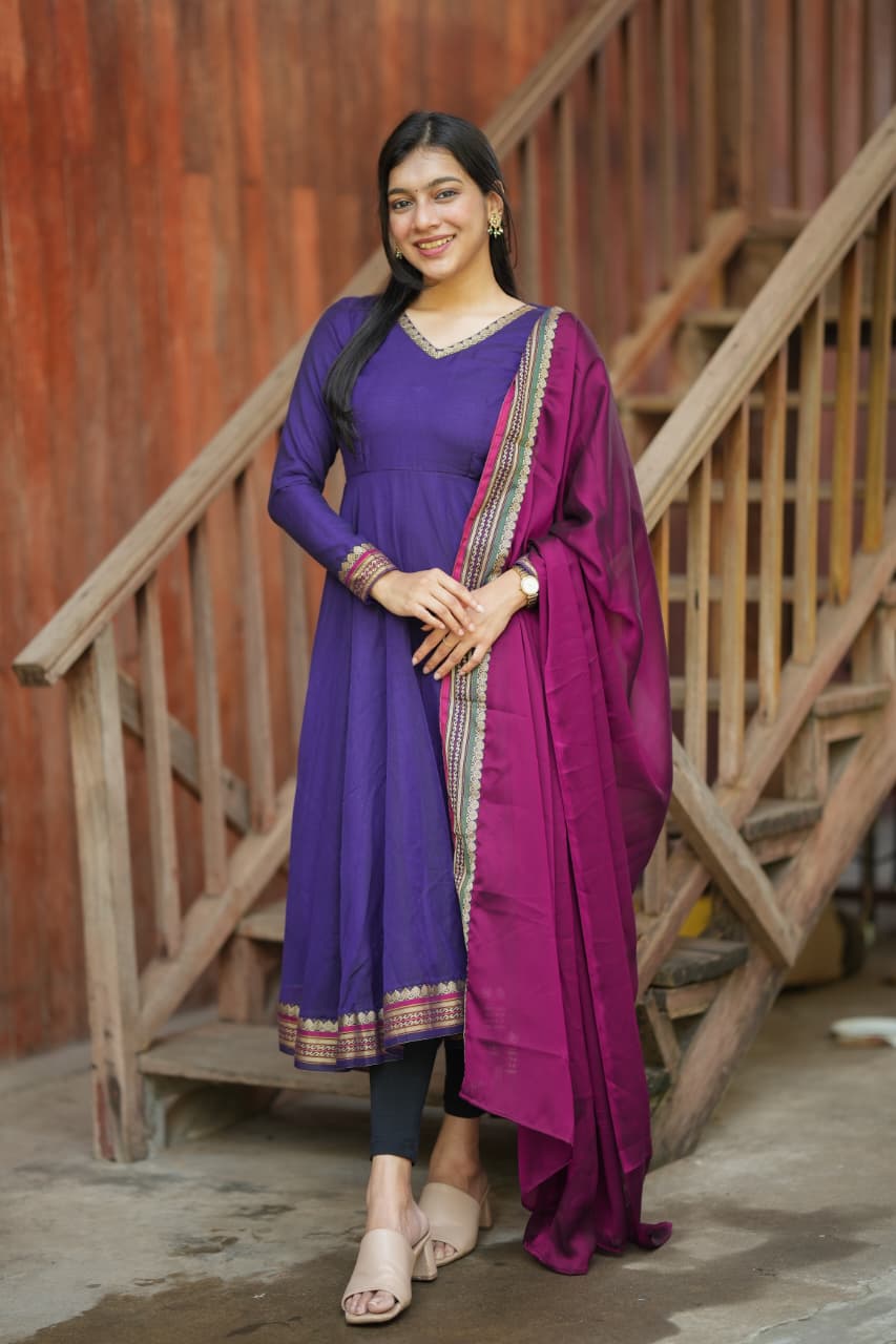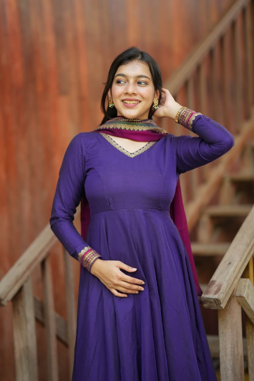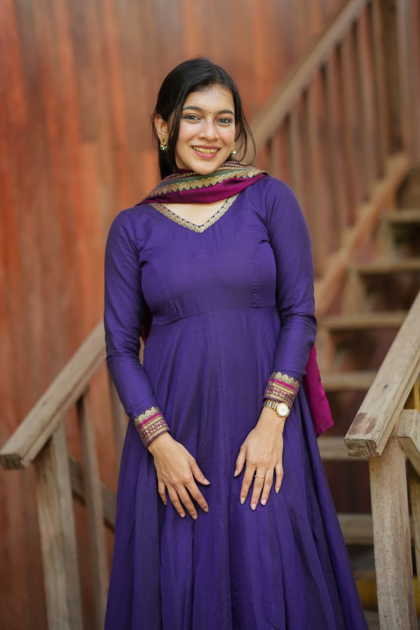 The Lavanya Series is a beautiful blend of simplicity and elegance, crafted from premium handloom fabric that reflects timeless ethnic charm. The rich purple tone paired with classic detailing creates a graceful silhouette, making it a perfect choice for both everyday elegance and festive wear.