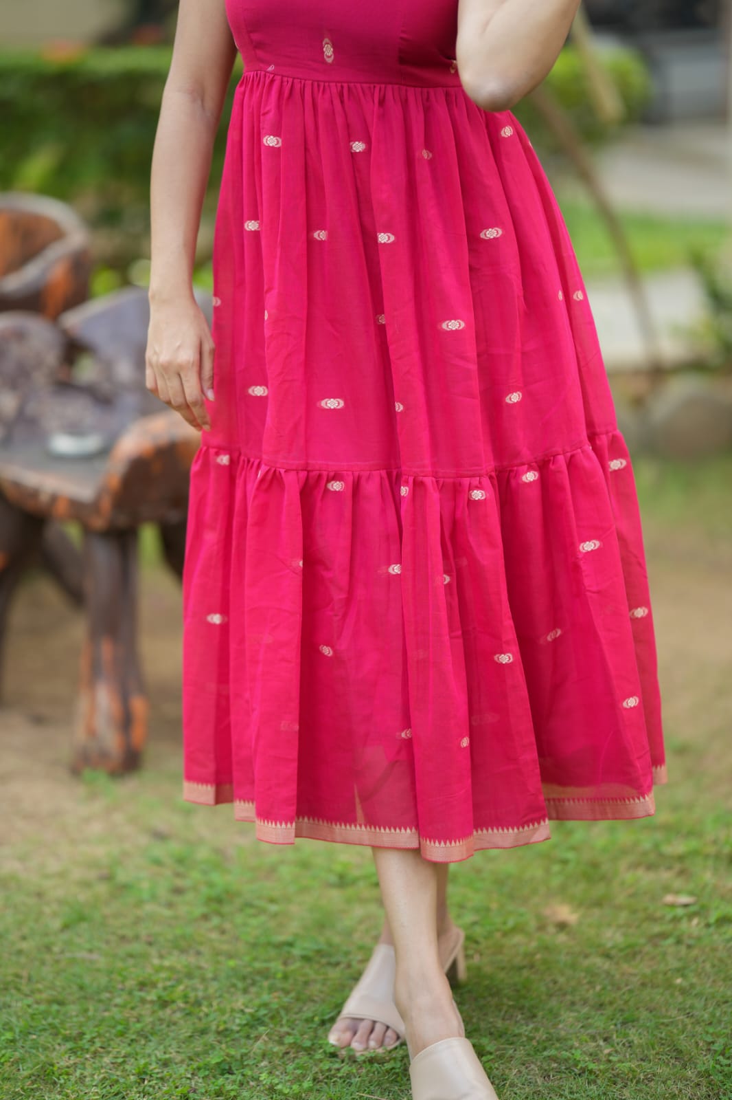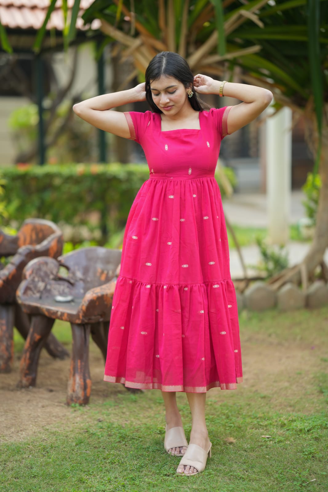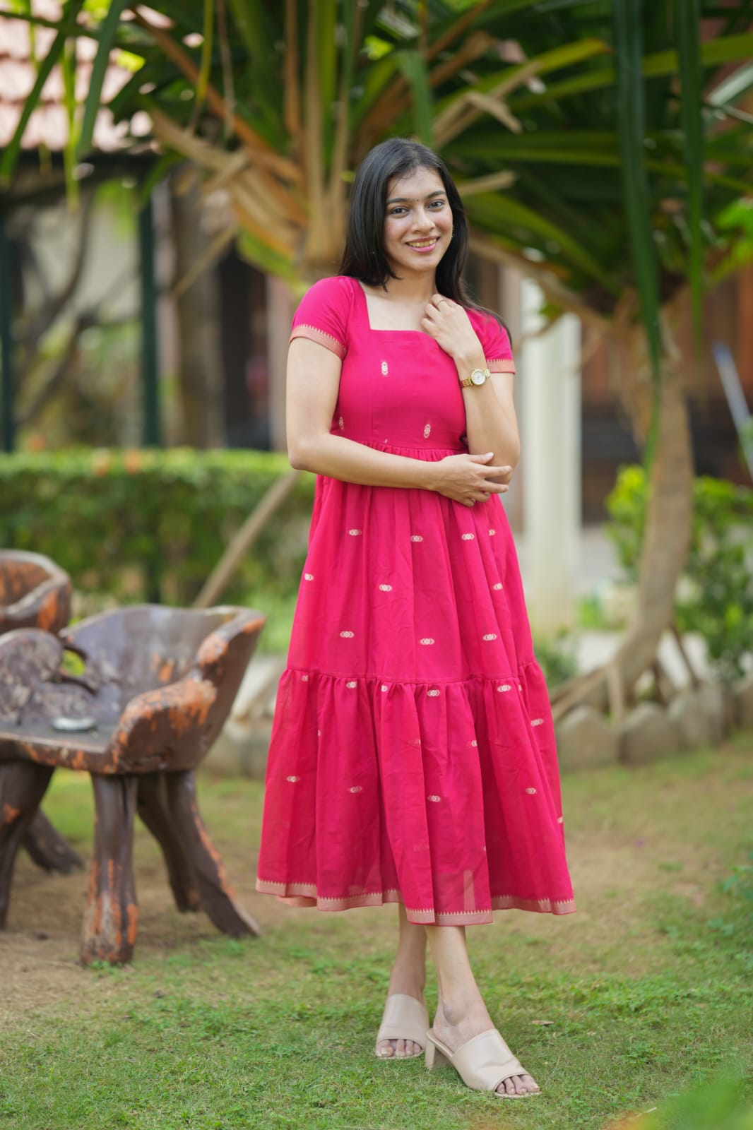 Designed with a flattering gathered pattern and soft flow, this handloom dress offers effortless comfort while maintaining a classic ethnic appeal. The flutter sleeves add a delicate feminine touch, enhancing its overall graceful look.
