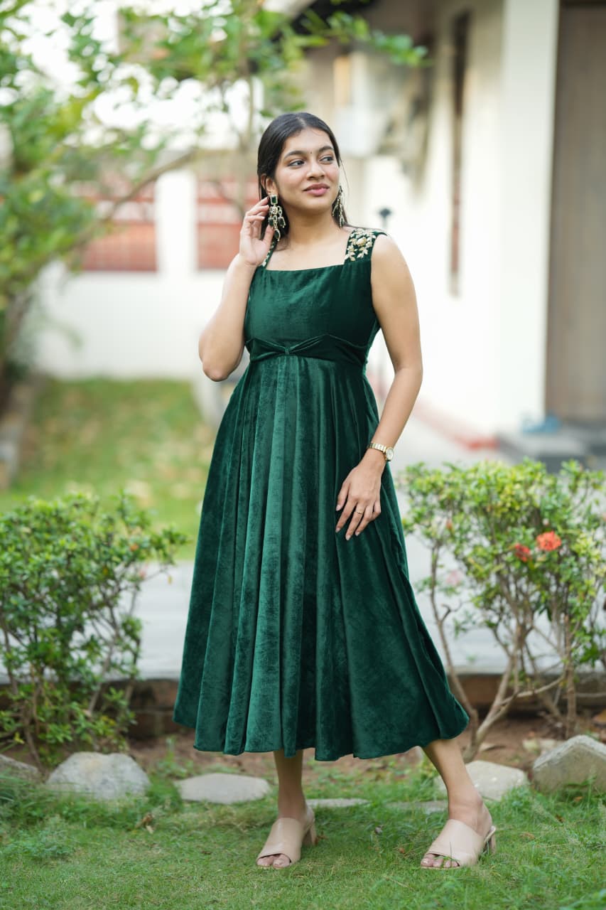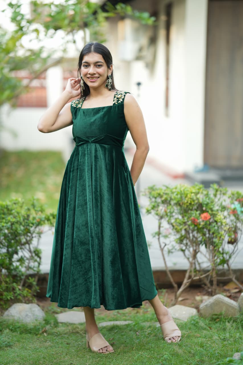 Designed with a flattering flared silhouette, this dress beautifully enhances movement while maintaining a structured and elegant look. The handwork on the shoulder area elevates the design, giving it a refined and festive appeal without being overdone.