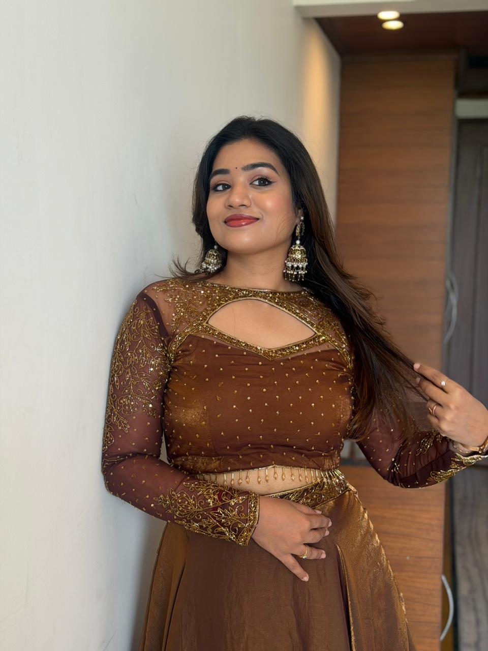 The Deepika Collection is a stunning fusion of elegance and grandeur, crafted from premium space silk fabric that offers a rich shine and graceful flow. The heavy handwork detailing on the bodice and sleeves enhances the royal appeal, making it a true statement piece for special occasions.