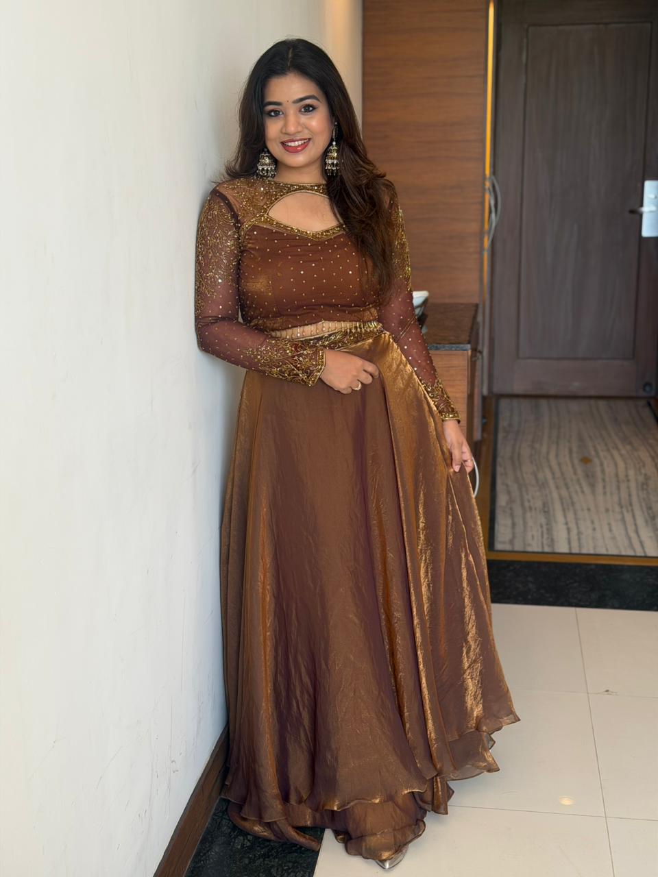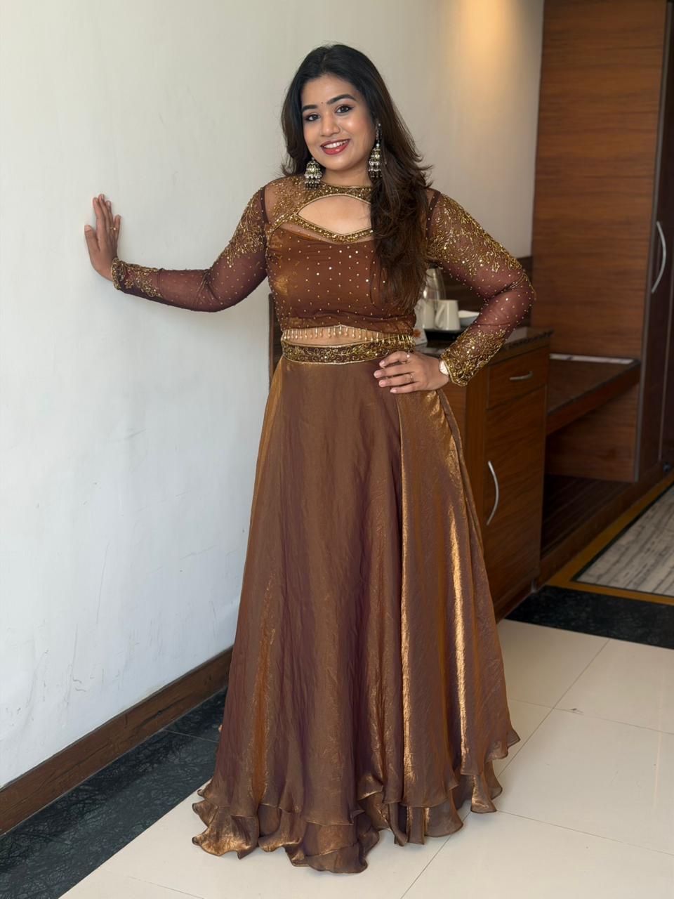 Space silk fabric gives a luxurious sheen with a smooth, flowy drape that moves gracefully with every step. The heavy handwork adds depth, texture, and festive richness to the overall look.