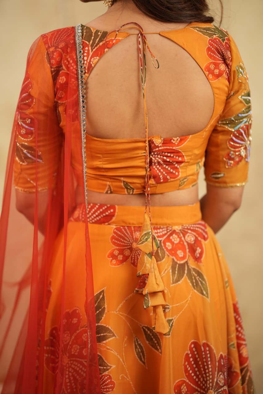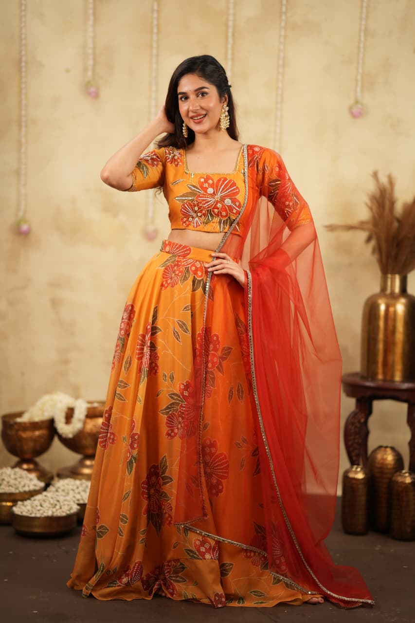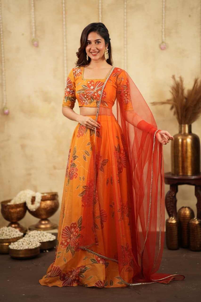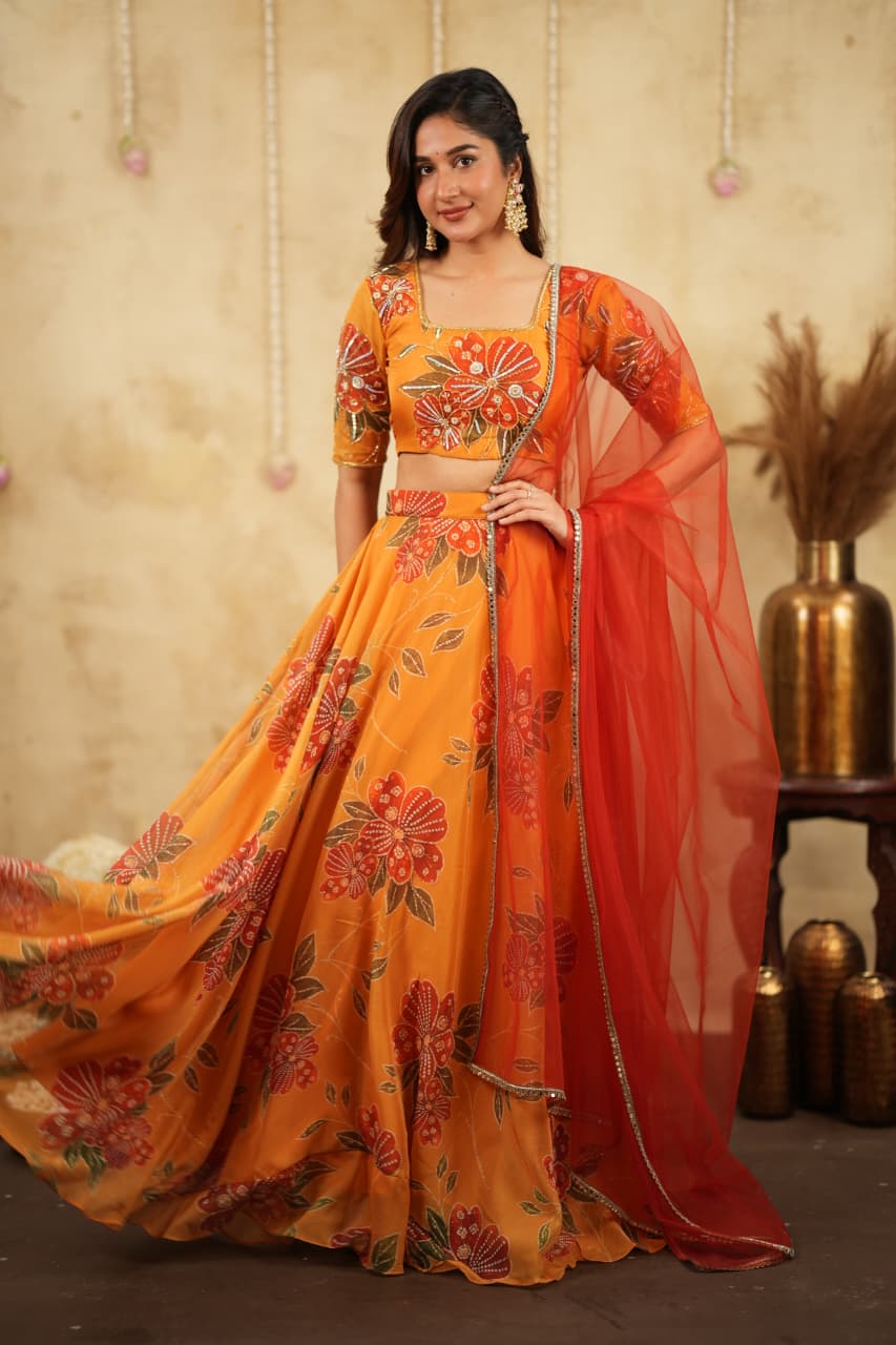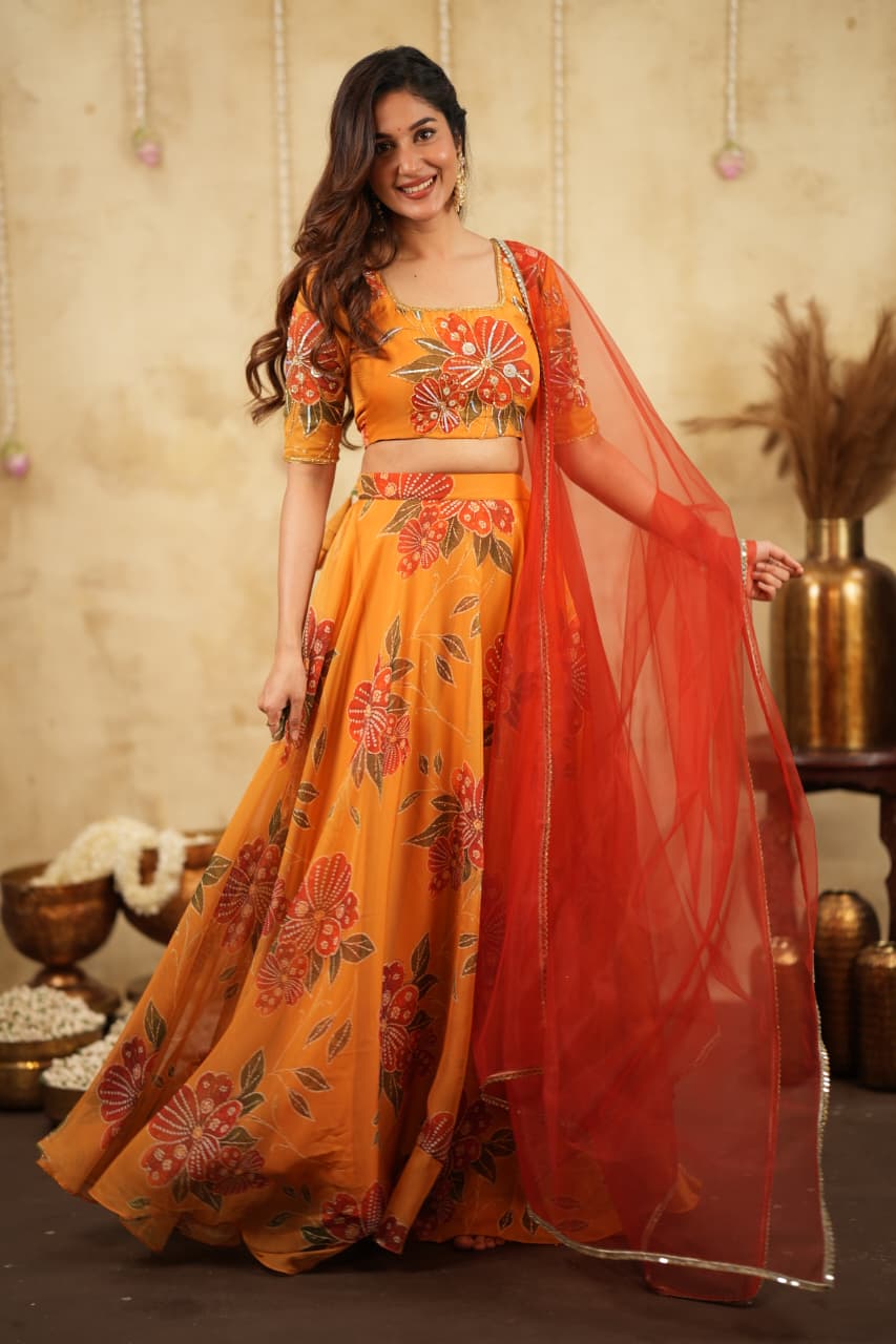 The Ruth Collection is a graceful fusion of elegance and festive vibrance, crafted from soft organza fabric that offers a lightweight, flowy silhouette with a refined sheen. The beautiful floral prints over the rich mustard base create a refreshing yet traditional charm, making it a standout choice for special celebrations and grand gatherings.