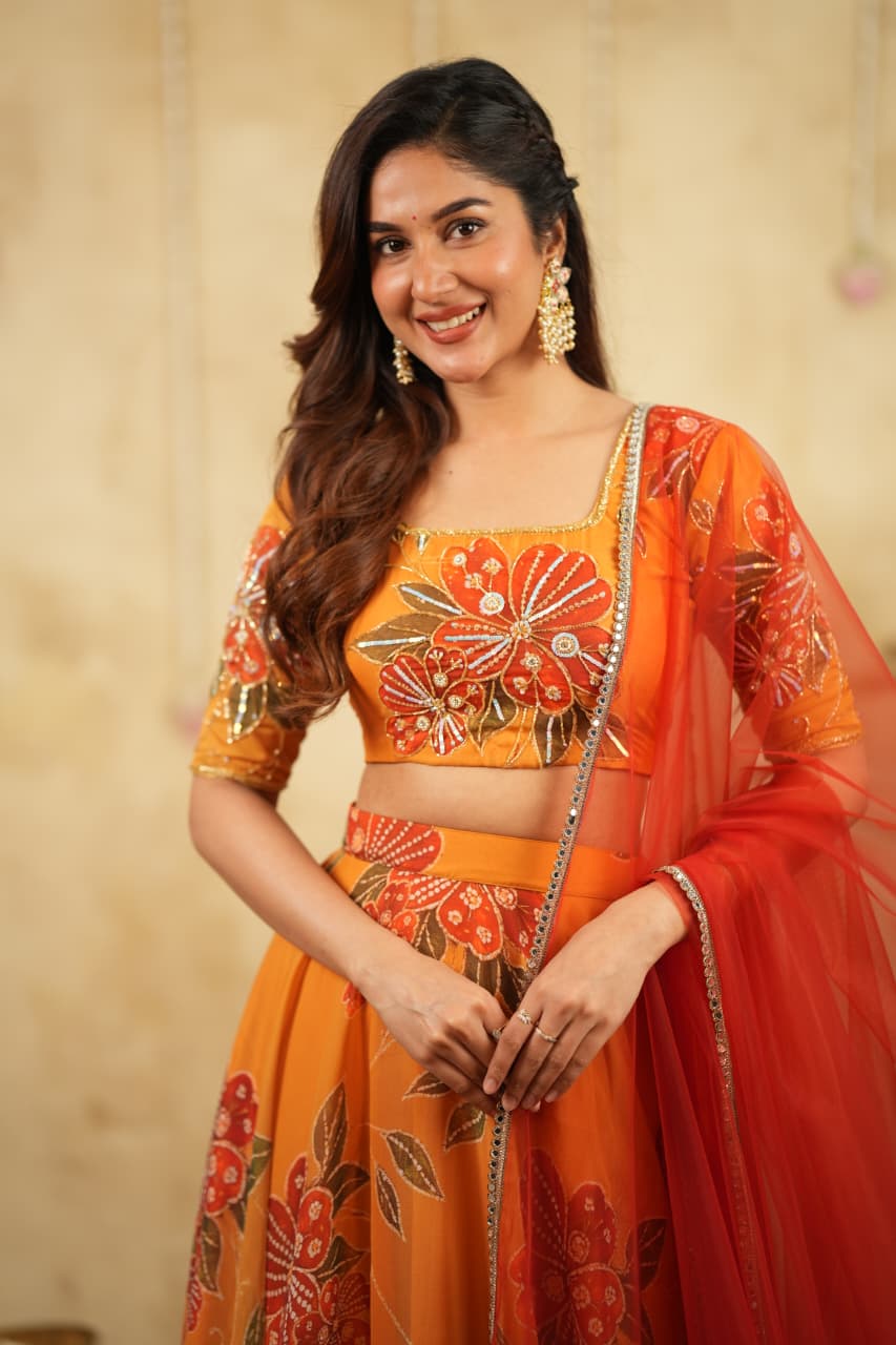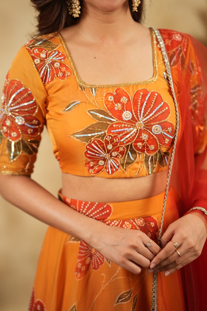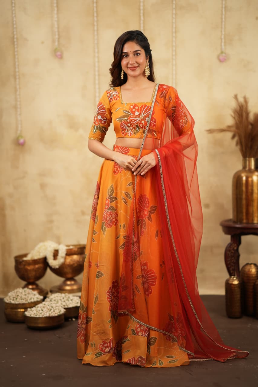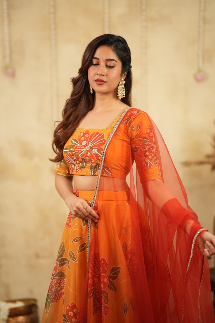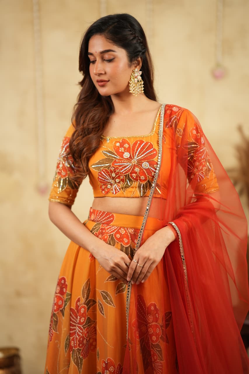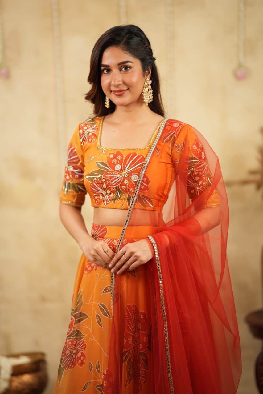 The Ruth Collection is a graceful fusion of elegance and festive vibrance, crafted from soft organza fabric that offers a lightweight, flowy silhouette with a refined sheen. The beautiful floral prints over the rich mustard base create a refreshing yet traditional charm, making it a standout choice for special celebrations and grand gatherings.