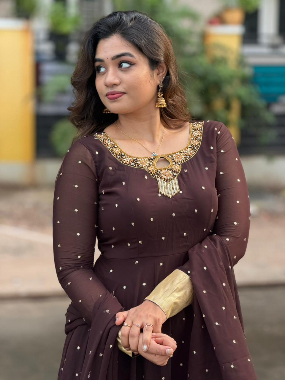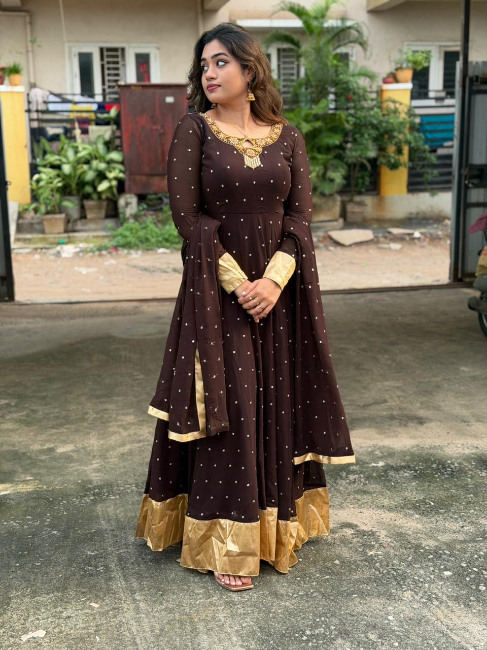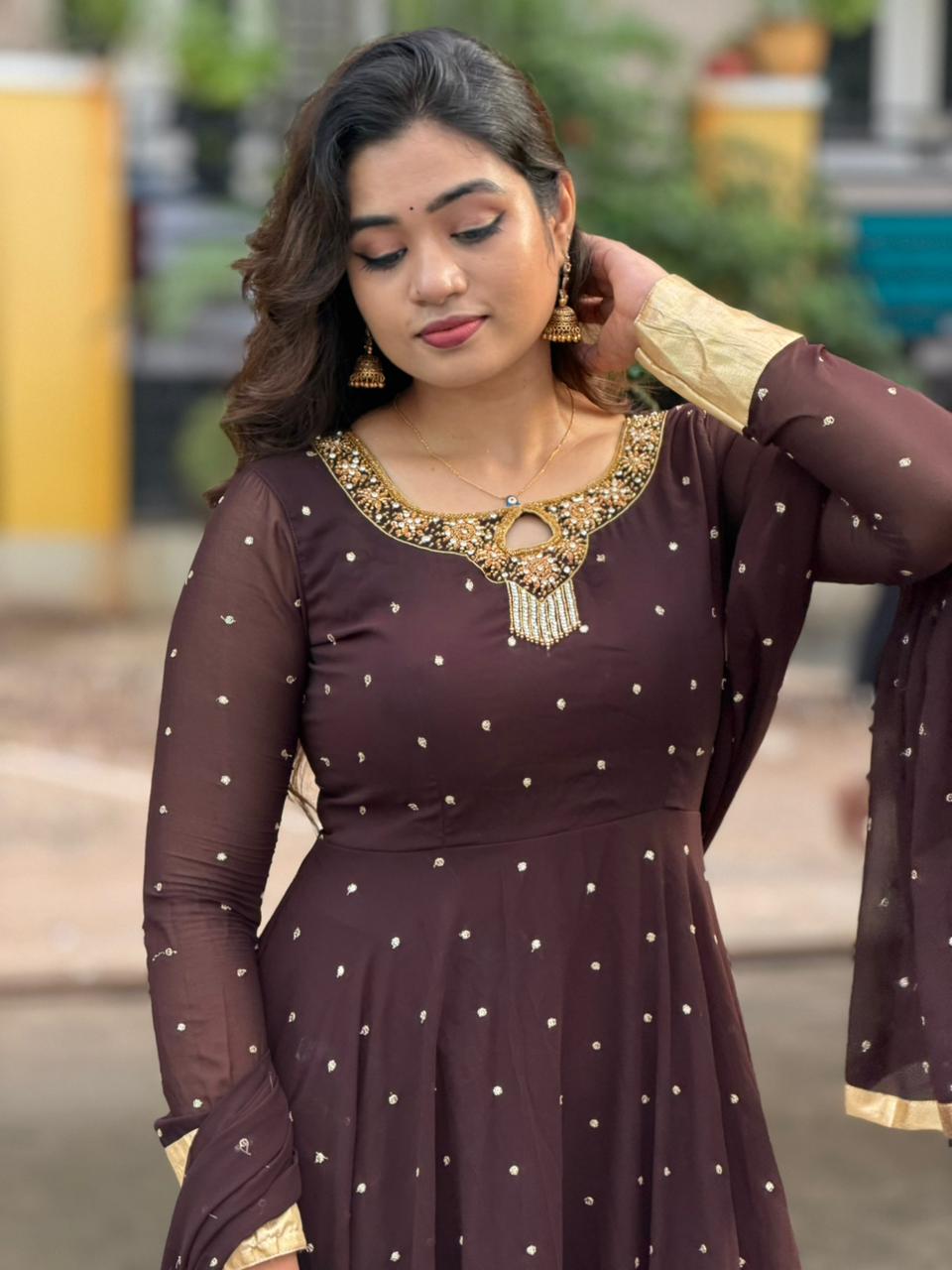 Experience timeless elegance with this rich butta georgette Anarkali, featuring a luxurious tissue border that adds a royal touch. The neckline is beautifully embellished with delicate beads and stone work, offering a graceful sparkle perfect for festive occasions. The flowing silhouette and full sleeves enhance the charm of this classic ensemble.