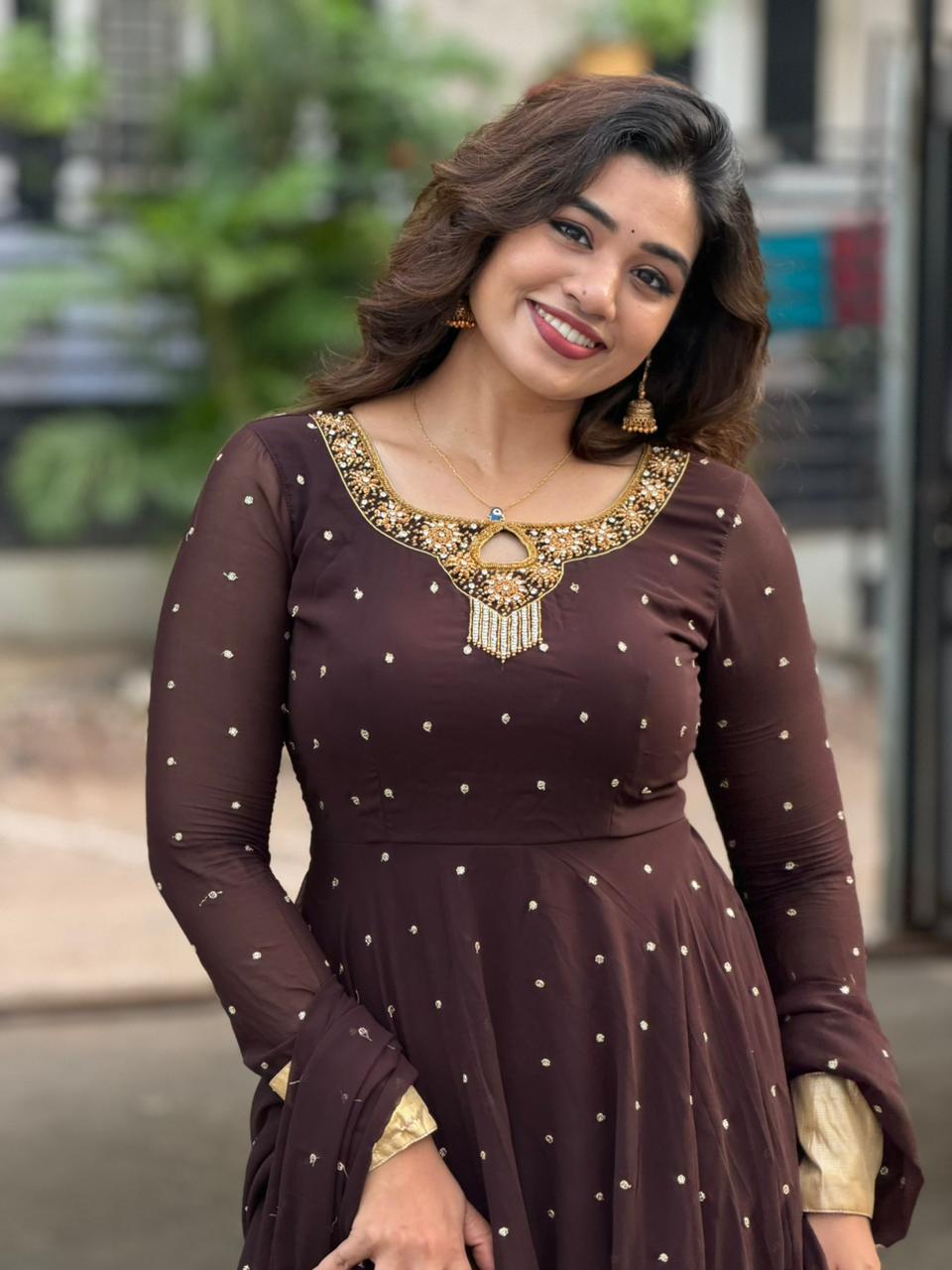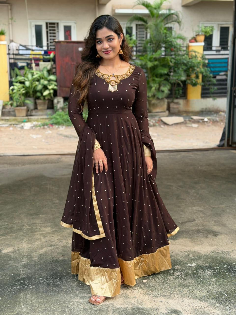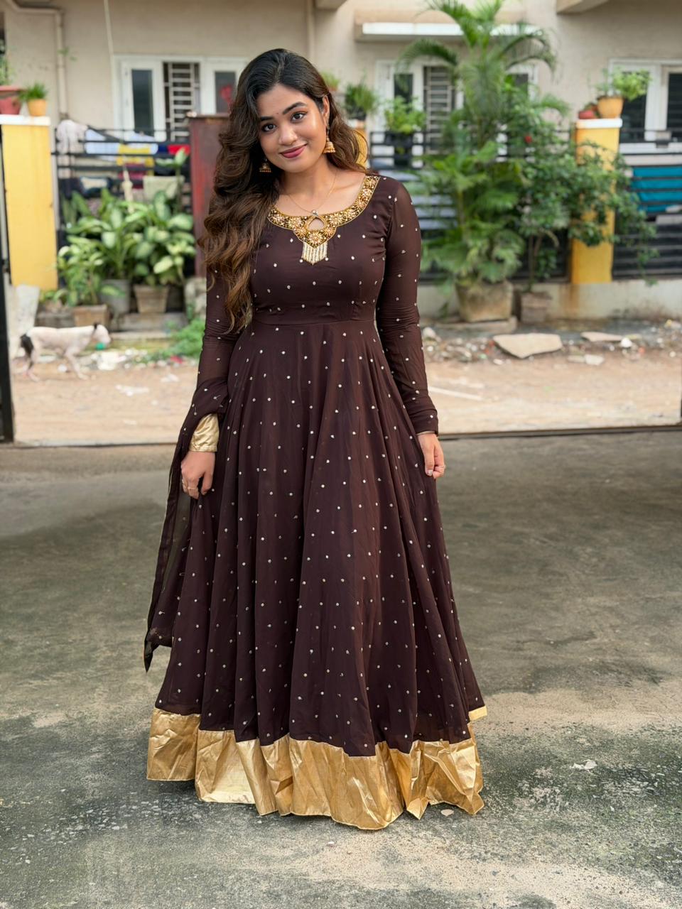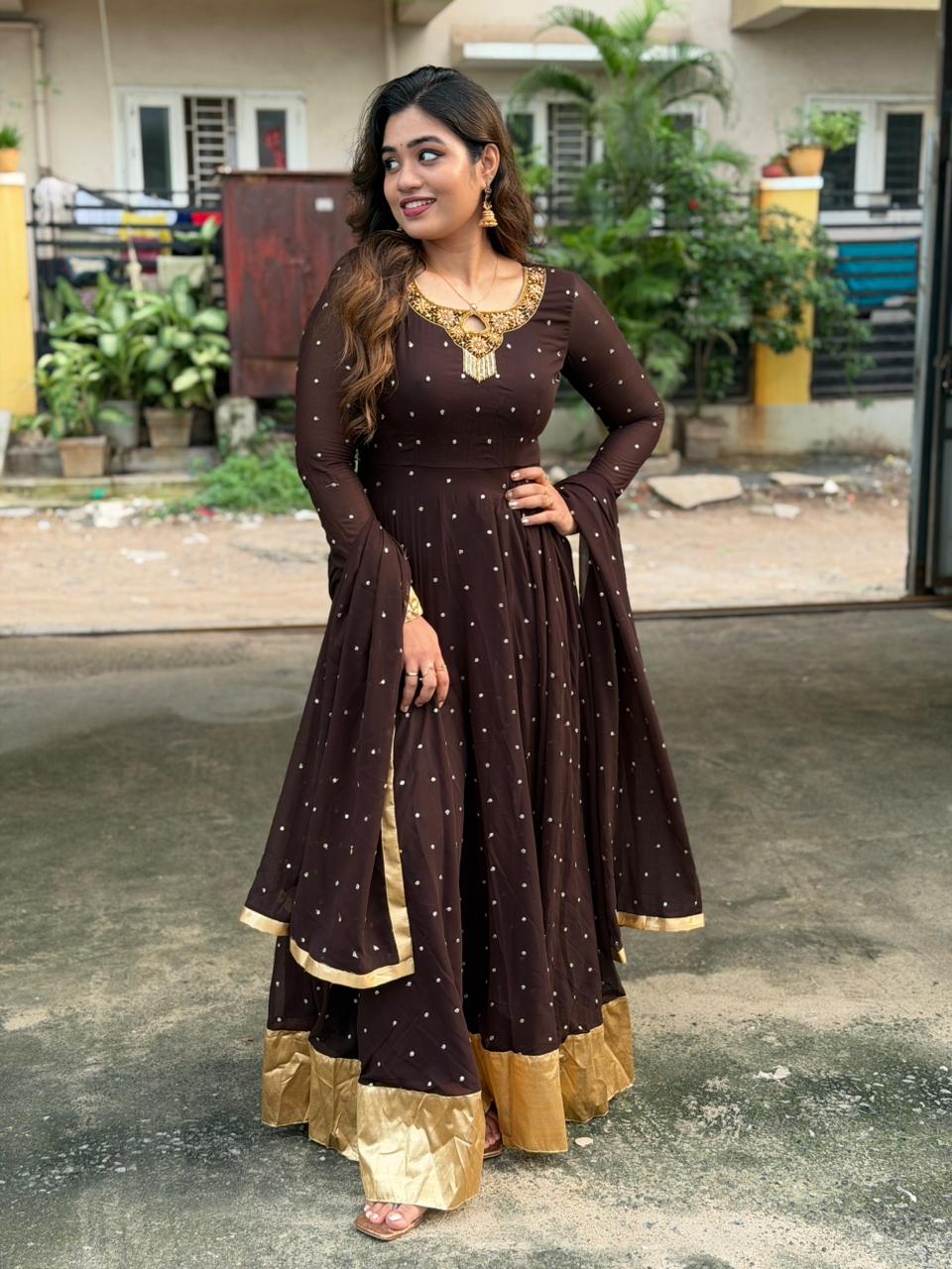 Experience timeless elegance with this rich butta georgette Anarkali, featuring a luxurious tissue border that adds a royal touch. The neckline is beautifully embellished with delicate beads and stone work, offering a graceful sparkle perfect for festive occasions. The flowing silhouette and full sleeves enhance the charm of this classic ensemble.