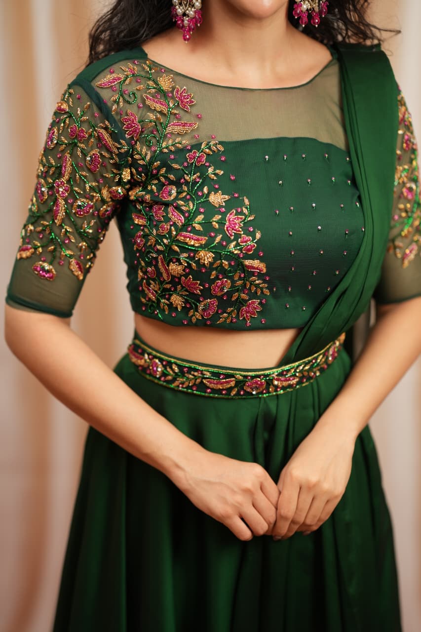 An exquisite blouse crafted from shiny georgette, featuring intricate cutdana handwork that adds a luxurious sparkle. Designed with half-sheer embroidered sleeves, giving a perfect balance of tradition and modern grace.