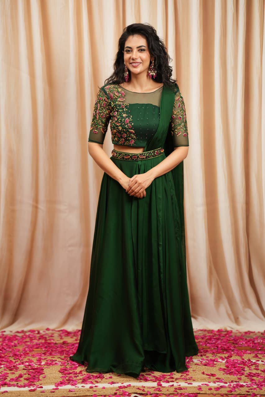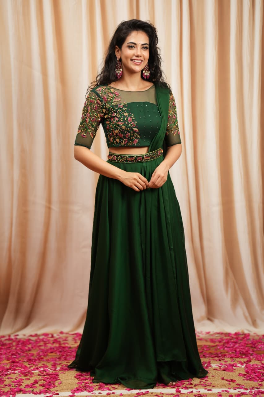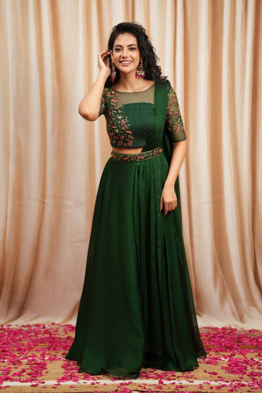 Gracefully flared lehenga made from premium shiny georgette, offering a soft, elegant fall with every twirl. The flowy silhouette brings out a regal and timeless charm ideal for festive evenings.