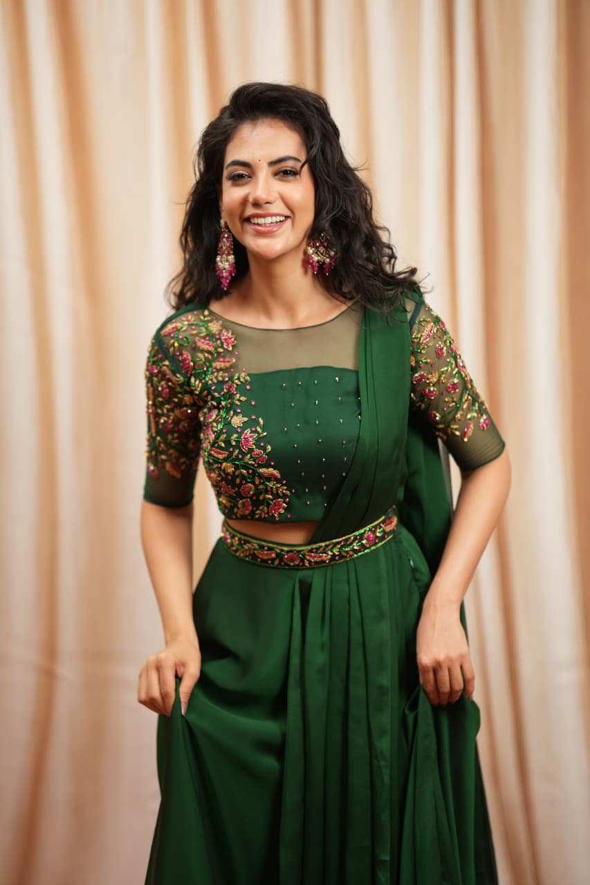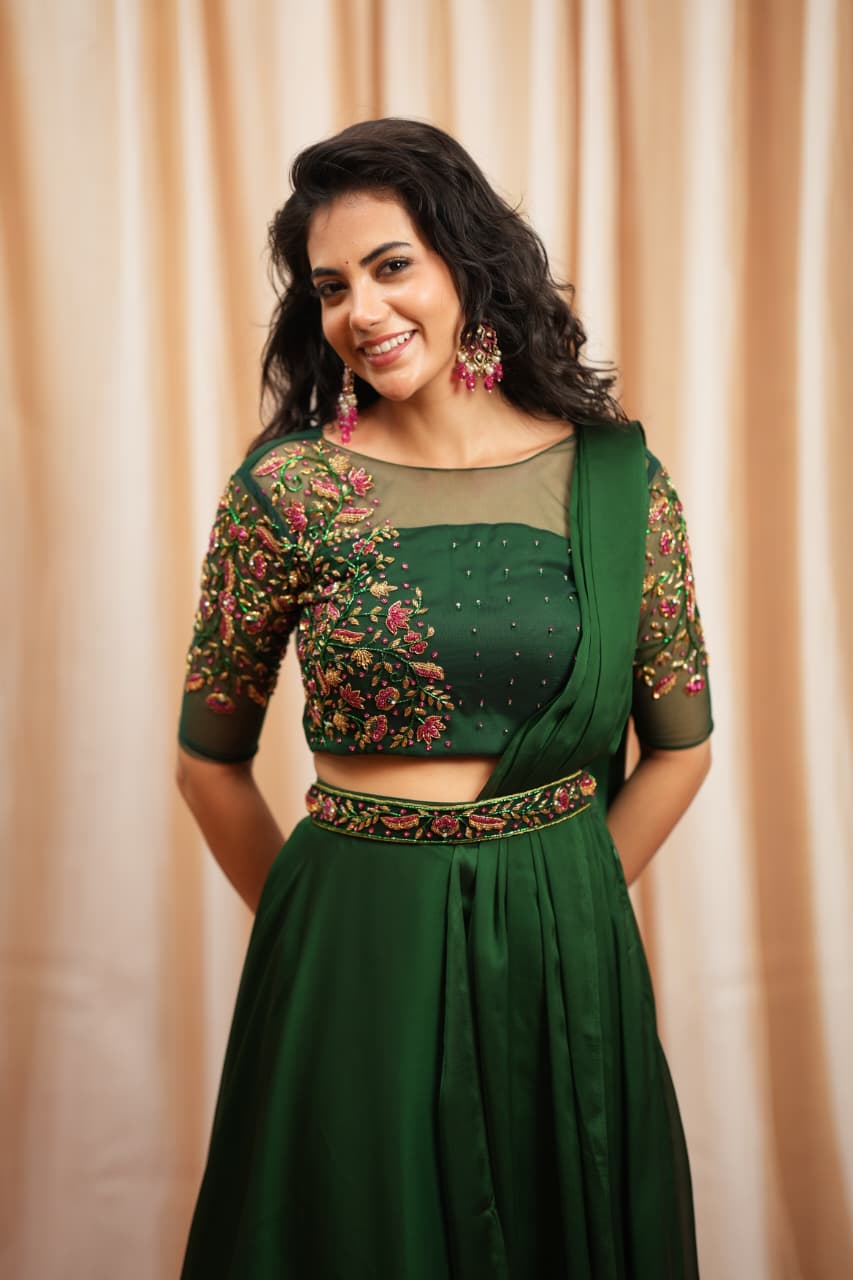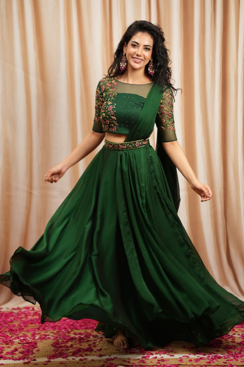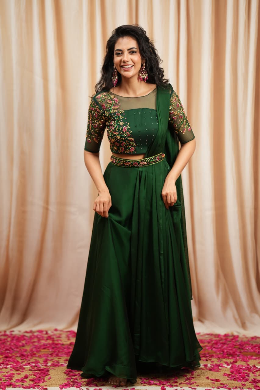 Gracefully flared lehenga made from premium shiny georgette, offering a soft, elegant fall with every twirl. The flowy silhouette brings out a regal and timeless charm ideal for festive evenings.